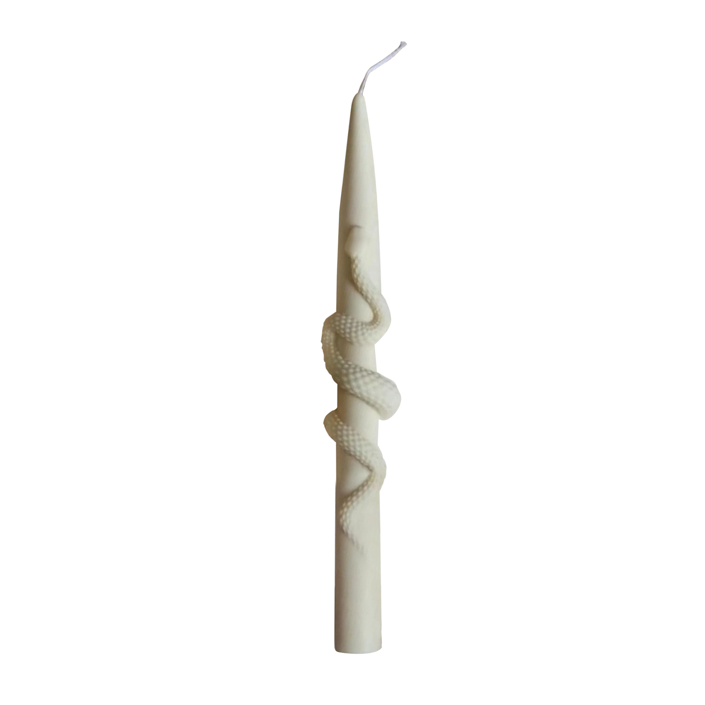 Yılan Figürlü Mum, burgu formdan ilham alan akıcı kıvrımları ve heykelsi duruşuyla dekorasyonda güçlü bir karakter oluşturur. Yılan figürünün dinamik yapısı, mum yakıldığında oluşan ışık ve gölgelerle birlikte mekâna derinlik ve dramatik bir etki kazandırır.